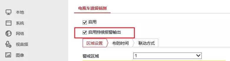 通过【事件】-【Smart事件】-【电瓶车遗留侦测】,勾选【启用】和【开启持续报警输出】,绘制检测区域。